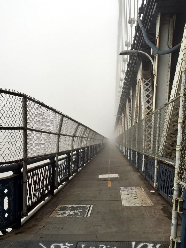 My favorite part of the trip by far is walking over the Manhattan Bridge. I work so early that I pretty much have the bridge to myself other than a couple of runners and people pushing carts of empty cans and bottles over to recycle in Brooklyn. It’s the one stretch of the walk that I usually just take out my earbuds and exist… No worrying about bumping into anyone else around me or paying attention for cars – just 1.3 miles of empty sidewalk with some of the most bitchin’ scenery New York has to offer, all as the sun is just starting to rise. Even when there’s no scenery it’s great… One morning in May it was so foggy that I could only see maybe 100′ in front of me. Usually I see all of lower Manhattan on the other side of the bridge, but that morning all I saw was nothing: