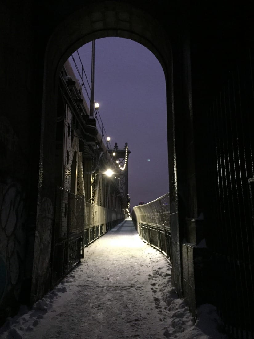 Much to my surprise I absolutely loved it. It took an hour and a half to walk vs. 45 minutes by train or bike, but I didn’t care. Snow = 0, Me = 1. It was the first time I’d really ever experienced the Manhattan Bridge – when I’m biking over it I’m too busy focusing on getting it over with to take in any scenery.. the first half is basically 3/4 mile of biking up a steady incline and it’s not the most fun thing to do. The way down on the other half is a blast, but too fast to really stop and smell the flowers, not to mention there aren’t any to smell. This is a pic from my first walk across the bridge, an archway about 1/4 of the way across: