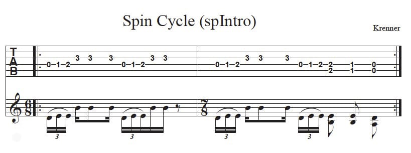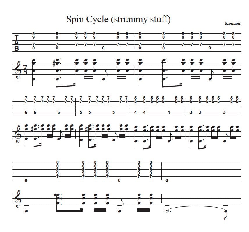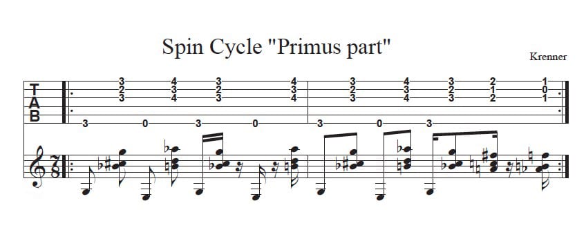 Here’s the “Primus part” that starts at around 1:45. The way I originally did this was to put my pick in my mouth (or accidentally drop it) and pick the low E string bass notes with my thumb and play the upper-register chords with my “IMA” (in classical guitar terms) fingers. That yields the cleanest and most predictable results, but over the years I started holding onto the pick and just kind raking it over everything. Perfect shmerfect, as Ace Frehley once said, “Look, it’s rock n roll!” Also, if you don’t fret guitar notes with your thumb, I highly recommend trying it if your thumb allows. It makes the low E and G bass notes in this a lot easier on the fretting hand. Plus it’s another finger just sitting there behind the neck. Why not put it to work?