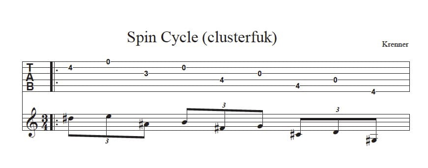 Brian Setzer did a really cool move in one of his many brilliant solos in Gene Vincent’s “Double Talkin’ Baby” on the Stray Cats Rumble In Brixton album/DVD that made me laugh and rewind the solo a dozen or so times the first time I heard it just for that part… He lowered the fingerings of the 5th fret guitar tuning method a half step and played them with their corresponding open strings resulting in a lovely little cascade of goofy dissonance – as we were doing the recording of “Spin” in July I decided to throw my own spin on that after almost every “Primus part”. Here’s what that looks like – picking-wise I start the first note (D# on B string) with my pick and pick every other note with my F-U finger. Each fretted note is played with pick, each open string is picked with the F-U finger. It looks like this: